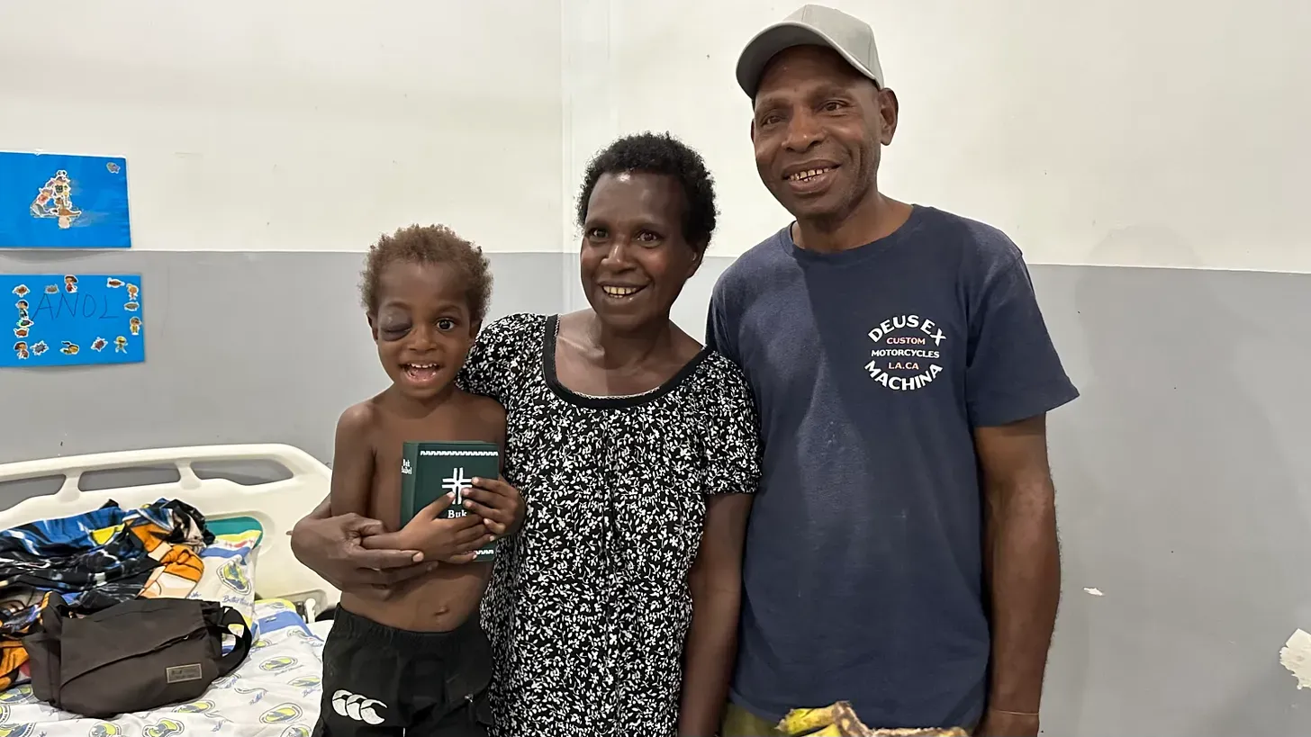 Several months before our family flew out of Wewak, our ministry had picked up a five year old boy named Abis from May River and brought him to the hospital in Wewak. Abis has aggressive eye cancer. A tumor had already displaced his left eye and was growing quickly so we flew him in for further examination. His parents, Jonah and Irene, came along.